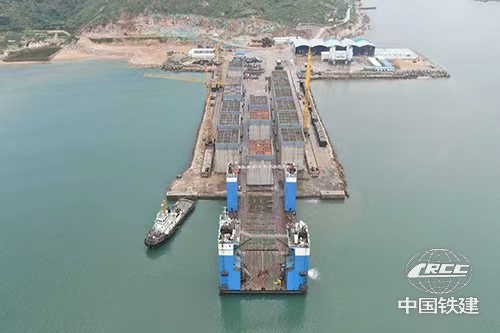 該項目共需預制安裝沉箱32個。單個沉箱長18.27米,寬17米,高17.7米,重約2500噸,是重力式碼頭施工的關鍵結構。開工以來,項目部全面實施精細化管理,從施工方案科學預控、氣象水文精準把控、設備工藝創新升級及施工管理精細優化等多維度發力,成功實現了安全生產前提下沉箱出運安裝的“特快閃送”,鑄就了響亮的“鐵建港航速度”。